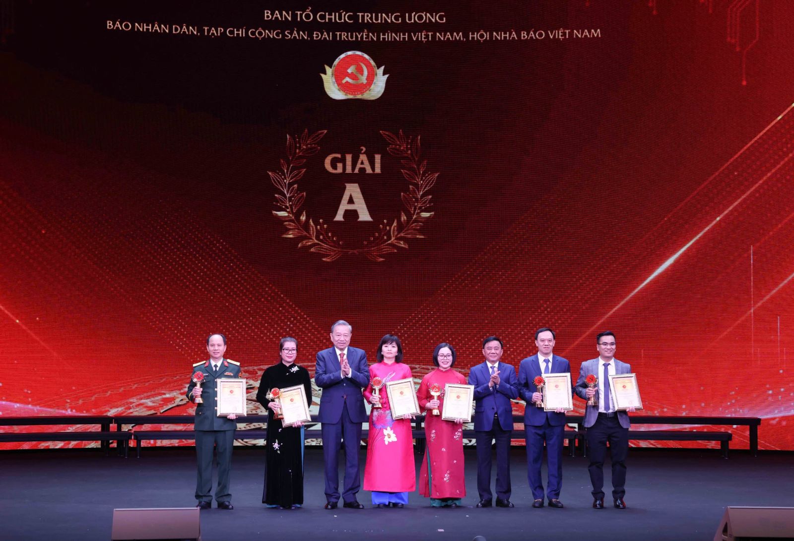 Tổng Bí thư Tô Lâm và đồng chí Trần Cẩm Tú, Uỷ viên Bộ Chính trị, Thường trực Ban Bí thư, Chủ nhiệm Uỷ ban Kiểm tra Trung ương, trao giải A cho các tác giả, nhóm tác giả.