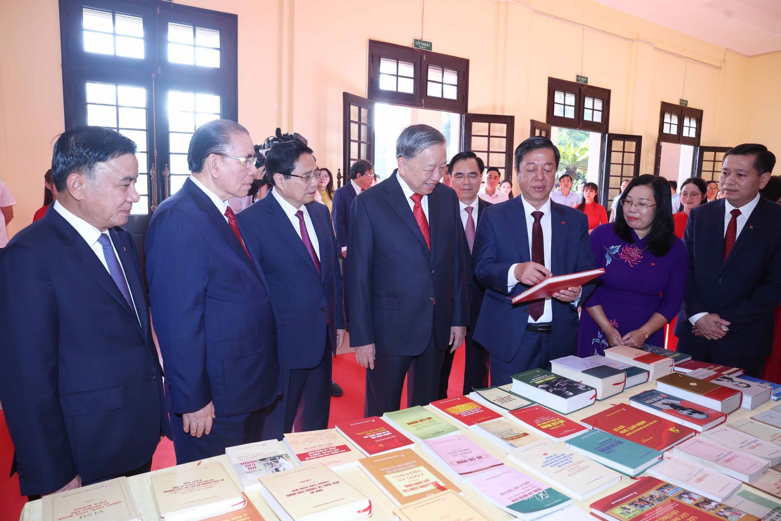 Tổng Bí thư Tô Lâm và các đồng chí Lãnh đạo, nguyên Lãnh đạo Đảng, Nhà nước xem trưng bày sách tại Đại hội